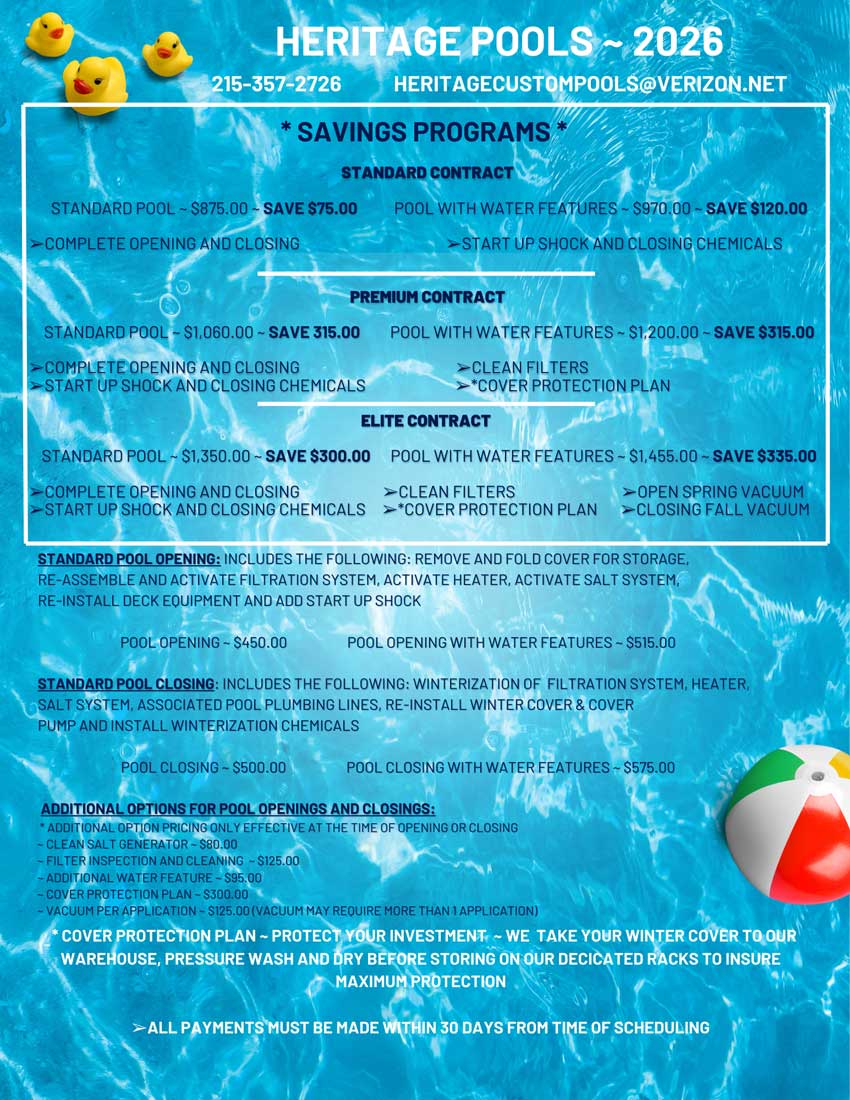 Heritage offers complete renovation packages for vinyl and concrete pools. Give your